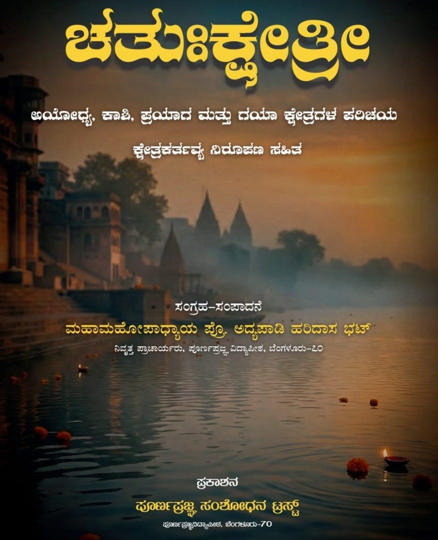 The new book 𝐂𝐡𝐚𝐭𝐮 𝐊𝐬𝐡𝐞𝐭𝐫𝐢, authored by Mahāmahōpādhyāya Shri Adyapadi Haridasa Bhat, has been released. This unique work explains in detail the four sacred Kshetras Kashi, Ayodhya, Gaya, and Prayaga along with essential do’s and don’ts, serving as a comprehensive tour guide for all Āstika Bhaktas. Price Rs. 80 Available at Matrushri Kamalamma Book Shop at 25 % Discount till 24th of December 2025